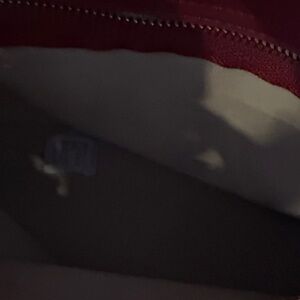 This elegant black handbag is perfect for any occasion. Its sleek design and high-quality material make it a must-have accessory. The interior features a striking red lining, adding a touch of sophistication. It has three compartments with center is zipped compartment. When purchased I was told it is leather but cannot be 100%. It has feet on the bottom and only carried twice.