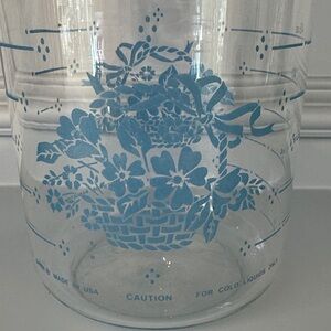 This is a Vintage Glass Pitcher with Cornflower Blue or Country Blue Pattern. The design features a blue floral basket motif, officially known as the "Cornflower Blue" pattern. The "Cornflower Blue" pattern was a popular design produced from 1957 into the late 1980s. Holds 48oz and for cold liquids only. No chips or cracks.