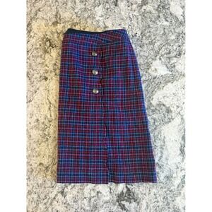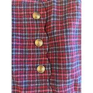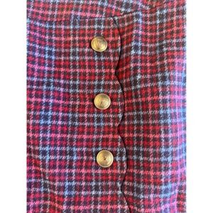 A stylish plaid wool blend A-line skirt from Talbots Plus. This skirt features a flattering A-line silhouette with decorative buttons along the side seam. The classic plaid pattern in shades of burgundy, blue, and pink makes it a versatile piece for various occasions. Perfect for a business casual office setting or a weekend outing.