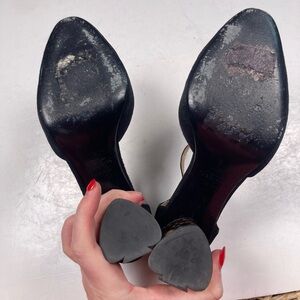 Excellent preloved condition, KATE SPADE NEW YORK Black Suede Tortoise Shell Spade Geometric Shape Heel Pump, black suede upper, closed toe, ankle buckle closure, tall tortoise shell heel in the shape of the spade, minimal cosmetic wear as shown, no tears or damage