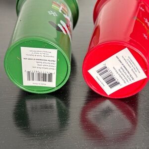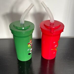 Set of two festive straw cups featuring Santa and a reindeer. Perfect for holiday celebrations, especially for children. 5.5” tall and 8.25” around main part of glass.