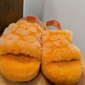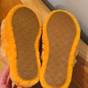 Bright orange fluffy slippers by UGG. Ideal for comfort and style. I purchased these but never wore them. These are size 4 but I normally wear a size 7. They fit me just fine as you can see in the photo. I can usually wear multiple sizes in Uggs. It depends on how snug you want them to fit. Please see photos for condition and wear.