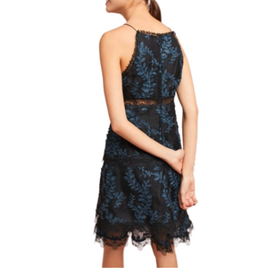 Monique LHullier Black Steel Blue Size 8 Dress Embroidered Silk Lace Anthro