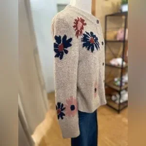 Cozy up in this stylish oatmeal sweater featuring a charming floral pattern. Warm wool blend and fall colors makes this ideal for cool months. Perfect for adding a touch of elegance to your wardrobe.