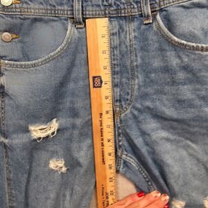 Stylish and retro H&M &Denim overalls in a light blue wash. Features heavy distressed detailing for a throwback 90s look. Perfect for Y2K and vintage streetwear fashion. Adjustable straps and multiple pockets for a comfortable and functional fit.