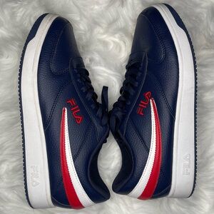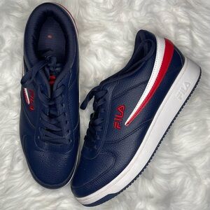 Stylish Fila sneakers. Navy with red and white accents. Comfortable and trendy.