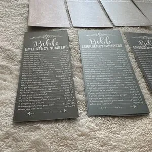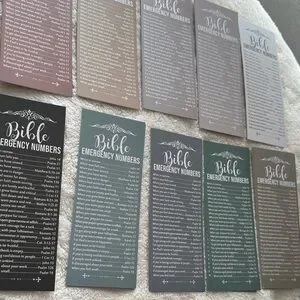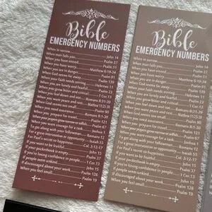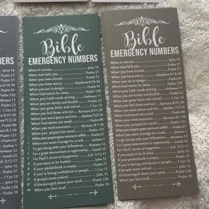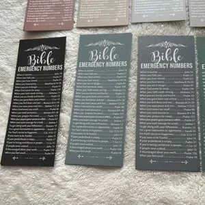 Set of Bible Emergency Numbers bookmarks in various colors. Perfect for spiritual guidance and inspiration.