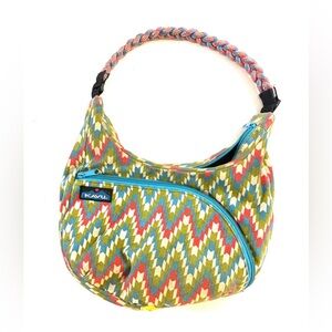 Bright and bold KAVU hobo bag with a zigzag pattern. Features a braided handle and front zipper pocket.