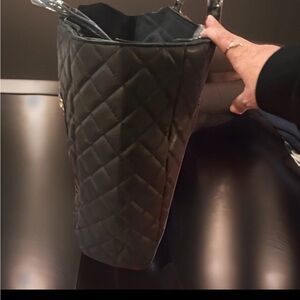 This elegant black quilted tote bag is perfect for any occasion. Featuring a stylish design and durable construction, it's a must-have accessory. 17x14x5-huge! Great work bag, stylish diaper bag, even for an overnight bag.