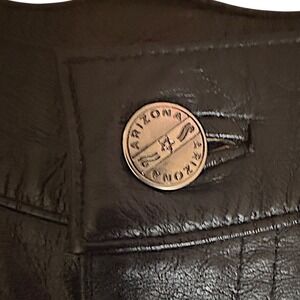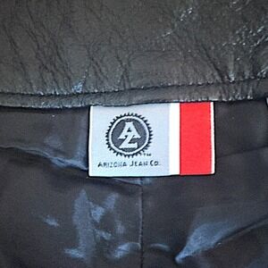 Embrace rugged style with these 1990's vintage genuine leather pants from Arizona Jean Co. Crafted from premium leather with a smooth polyester lining, these pants offer both durability and comfort. The classic black hue and timeless straight-leg cut make them incredibly versatile, perfect for channeling a cool biker aesthetic or adding an edgy touch to any outfit. The distinctive metal button featuring the Arizona logo adds a unique detail.