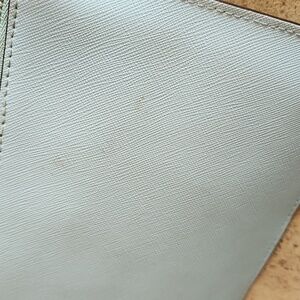 Elegant light blue wristlet clutch, perfect for any occasion. Features a sleek design with a convenient strap for easy carrying.