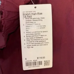 ✨NWT Lululemon Stretch High-Rise Pant 7/8 Length in Red Merlot