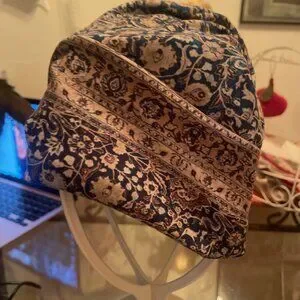 A wearable work of art. This William Morris–inspired bucket hat features an intricate floral tapestry pattern in deep navy, warm tan, and soft golden tones. Rich, classic, and unmistakably Arts and Crafts in spirit, it brings old-world charm to a modern silhouette.