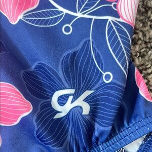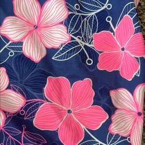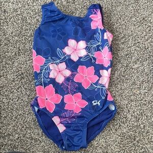 Navy leotard with vibrant pink floral design. Perfect for dance performances.