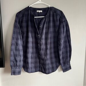 Stylish navy checkered blouse. Button-up front. Long sleeves. Perfect for casual wear.