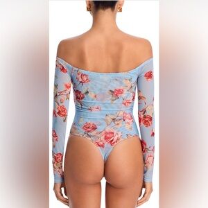 Elegant off-shoulder bodysuit with floral pattern. Light blue with red and pink flowers.