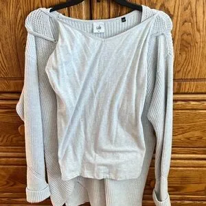 CAbi Soft Gray Knit V-Neck Sweater with cami.
