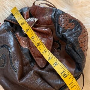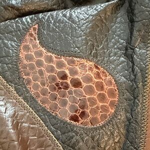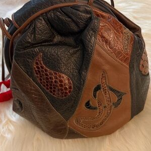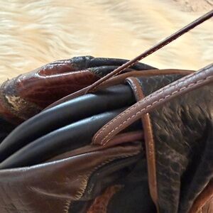 Discover the elegance of this leather patchwork bag, featuring a unique blend of black and brown tones. Perfect for any occasion. NWOT