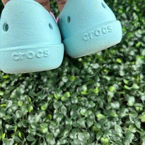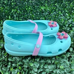 Crocs Sandals shoes with pink flower accents. Ideal for water play.