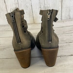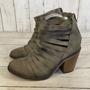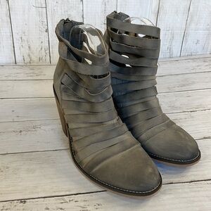Stacked heel strappy leather ankle boots with full coverage to mid-instep. Zip up closure on back.