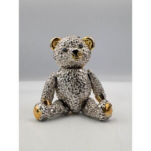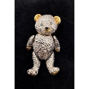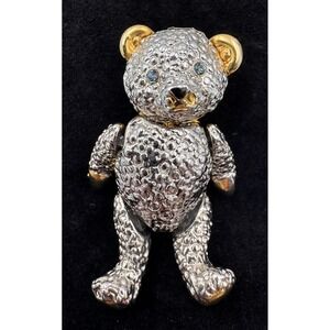 Vintage Silver Gold Tone Articulated Teddy Bear Pendant Brooch Blue Crystal Eyes