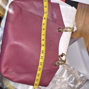 Chic shoulder bag in deep plum. Gold chain straps and logo charm. Perfect for versatile style. This bag is in perfect condition, and comes with tags and the box!