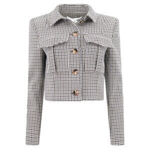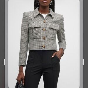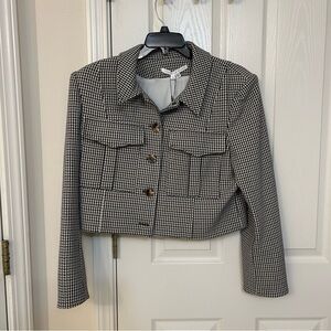 New with tag. The price tag is missing. The spare button tag/pocket is still on. Veronica Beard "Fulham" cropped Houndstooth jacket with padded shoulders Point collar Single-breasted front Bracelet sleeves; button cuffs Chest flap pockets Tailored fit Hem sits at the hip Button-front closure Polyester/viscose/elastane Polyester/elastane lining Made in USA from imported materials