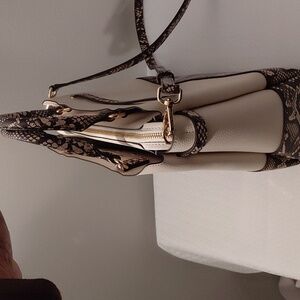 Stylish Michael Kors satchel. Cream body with brown detailing. It is crafted from pebbled leather. Removable crossbody strap. Dimensions: 13.25" W x 9.25" H x 5.25" D