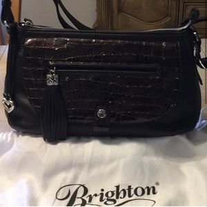 Elegant Brighton shoulder bag. Features black leather with brown textured flap. Silver heart charm accent. Perfect for any occasion.