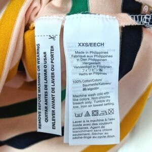 Made from soft, structured cotton for a streamlined fit, this striped top is an effortless solution to day or night. It's light pink in color with navy, gold, and green horizontal stripes. It's a bit oversized for a roomy, comfortable fit and the longer length makes it perfect for tucking into jeans or wearing on top of leggings. Super cute!