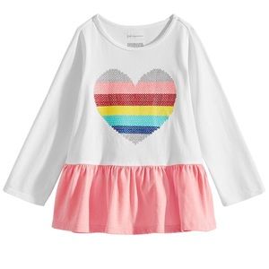 A rainbow-print heart and contrasting peplum hemline add adorable details to this super soft cotton tunic from First Impressions.