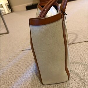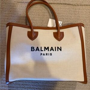 Balmain tote with beige canvas and brown leather trim. Original tags and duster. Zero marks or stains. Never carried. Original tags on bag