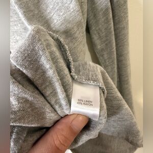 Super stretchy and comfortable. Not your average stiff blazer. Linen and rayon blend. Gray. No buttons or other closures. Great for business casual or just a casual outfit with jeans. Minor pilling. No stains or holes. Measurements are taken without stretching the garment so there may be flexibility in the sizing.