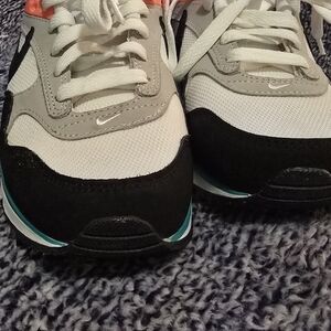 Nike Air Max sneakers featuring a stylish black and white design with teal and red accents. Perfect for casual wear.
