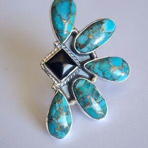 Elevate your style with this Sterling Silver artistic turquoise and black onyx Ajustable ring size 7 and up. A perfect accessory to enhance any ensemble.