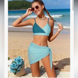 Stylish blue and teal bikini set with matching cover-up. Perfect for the beach.