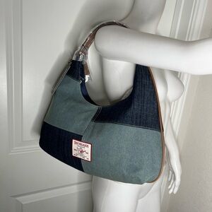 This stylish and fashionable ladies satchel handbag features a lightweight and durable cotton and polyester construction with a distinctive patchwork aesthetic, sleek silver hardware, spacious main compartment, and an exterior front zipper pocket with the iconic True Religion Buddha logo