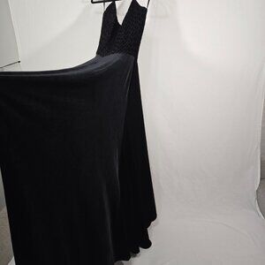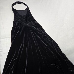 U.S.A Vintage CACHE 80s 90s Y2K Grunge Whimsigoth Witchy BLACK VELVET Embroidered Ruched Halter Back Opening Flowy Flare Asymmetrical Hem