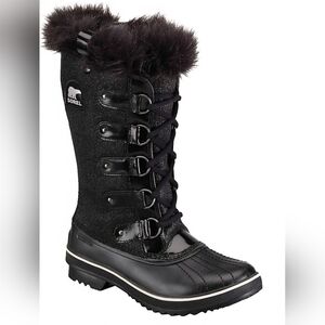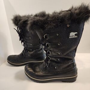 Sorel Womens Tofino Black Glitter Faux Fur Lace Up Waterproof Boots, Size 10
