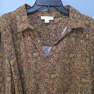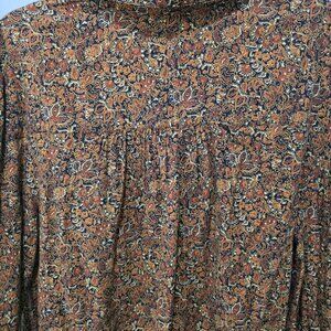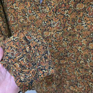 This Treasure & Bond paisley blouse blends vintage-inspired charm with modern comfort. Made from 100% cotton, it’s lightweight, breathable, and perfect for year-round wear. The rich brown, gold, and rust tones give it a warm boho feel, while the puff sleeves, collared neckline, and relaxed fit make it an effortless choice for workwear, weekend outfits, or a polished casual look.