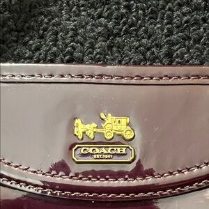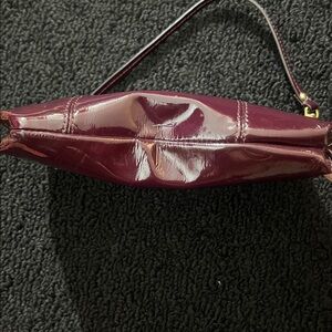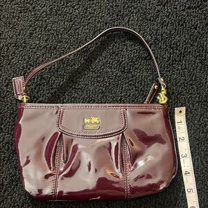 Chic and glossy Coach wristlet. Deep burgundy/Plum patent leather. Ideal for stylish outings.