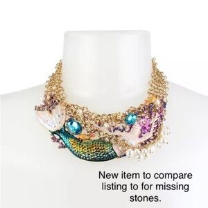 Make a splash with this rare, retired Betsey Johnson mermaid statement necklace — a bold, whimsical piece perfect for collectors and jewelry lovers! Featuring an intricately detailed mermaid centerpiece, luminous faux pearls, sparkling blue crystal accents, and layered gold-tone chains, this necklace is a true standout.