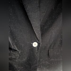 Elegant black velvet blazer with single button. Ideal for work or casual wear. Classic and versatile style.