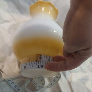 Romantic vintage milk glass hurricane lamp shade featuring a soft white to warm amber ombré glow and delicate floral detailing. The gently scalloped rim and rounded silhouette give this piece a timeless, cottage-inspired charm.