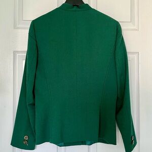 Chic forest green blazer with a tailored fit. Features a single button closure and sleek lines. It has two pockets. This has been worn once or twice.