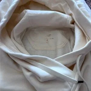 Soft and cozy Arc’teryx pullover hoodie in a beautiful cream / off-white color. Features the signature embroidered skeletal bird logo near the hem, adjustable drawstring hood, and ribbed cuffs and waistband for a flattering fit.