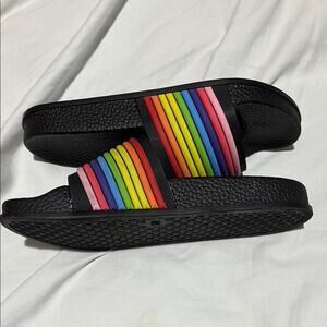 Vibrant slide sandals with rainbow straps. Perfect for casual wear pool swim beach coastal swimming lake mountain boating boat waterpark casual moulded footbed