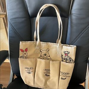 Canvas tote bag featuring Winnie the Pooh, Piglet, and Tigger. Beige color with playful character designs.