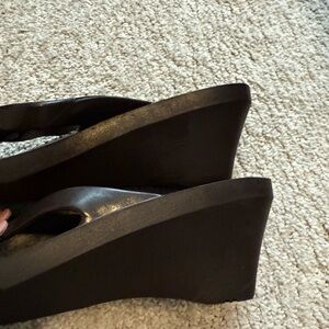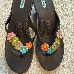 Oka-B Floral Wedge Platform Flip Flops ML (8-9.5) Brown Multi-Flower Gently Used