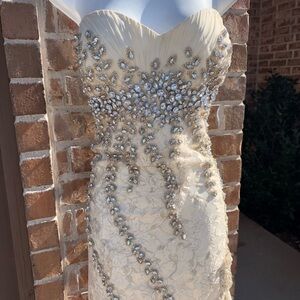 Terani Couture Champagne Fitted Crystal Beaded Gown with Slit size 20 NWT